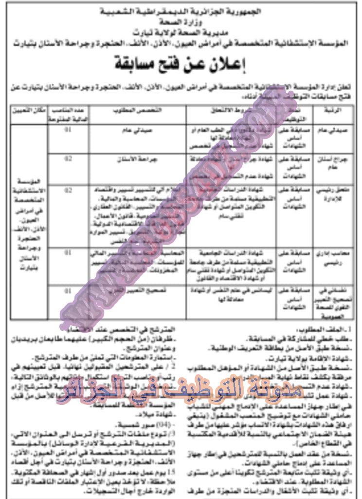 تعلن المؤسسة الاستشفائية المتخصصة في امراض العيون الاذن الانف الحنجرة وجراحة الاسنان بتيارت عن فتح مسابقات توظيف على اساس الشهادة في الرتب المبينة ادناه