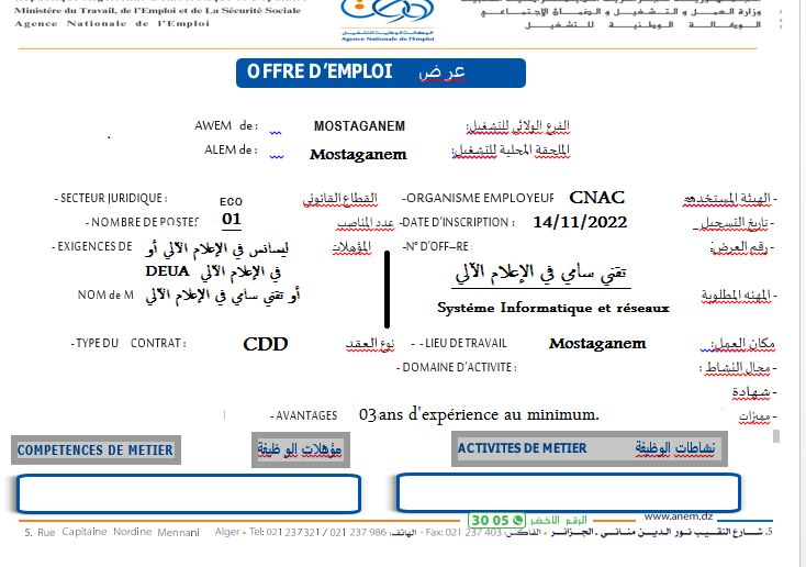 يعلن الصندوق الوطني للتأمين عن البطالة CNAC مستغانم عن فتح عرض عمل برتب التالية