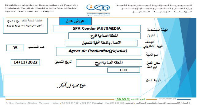 تعلن شركة كوندور condor spa عن فتح عرض عمل 30 منصب ببرج بوعريريج