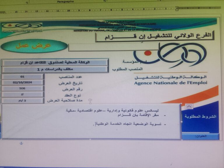 تعلن الوكالة المحلية لصندوق للتقاعد عين قزام عن فتح مناصب عمل في عدة تخصصات